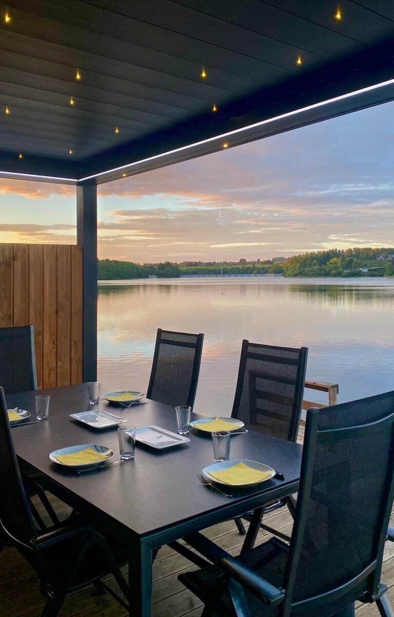 L’un des grands atouts du Beverly Weekend est la possibilité de privatiser une terrasse avec barbecue au bord du lac de Butgenbach. Imaginez-vous, en couple, en famille ou entre amis, installés face à l’eau, dans un cadre paisible et verdoyant, profitant d’un repas convivial en plein air. Chaque terrasse a été spécialement pensée pour offrir une expérience haut de gamme : une pergola à lames orientables pour s’adapter à la météo, des enceintes Bluetooth pour diffuser votre musique préférée, et un éclairage LED tamisé qui crée une atmosphère magique dès la tombée de la nuit. L’espace est entièrement équipé avec des meubles de salon confortables, des chaises longues, une grande table et tout le nécessaire pour passer une soirée inoubliable. Que ce soit pour un dîner romantique, une soirée barbecue en famille ou une fête entre amis, cette terrasse privatisée transforme votre séjour en un moment exclusif, mêlant détente, gastronomie et paysages d’exception.