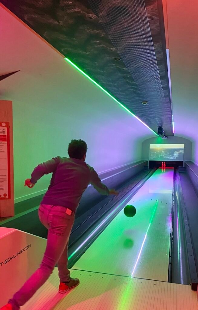 Bowling high-tech avec effets spéciaux et espace lounge.